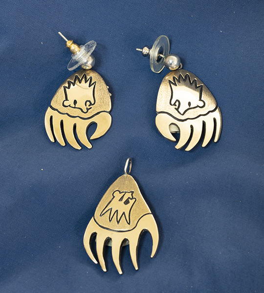 Watson Honanie created this pendant and earring set by overlaying 14k image of a Bear Paw on sterling. As a member of the Bear Clan, the bear paw is Watson’s hallmark.
